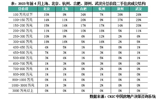 上海、北京、杭州、合肥、郑州、武汉低总价二手房产品愈加畅销,合肥、郑州、武汉100万以下产品成交占比达到3成左右,京沪杭200万元以下产品成交占比也达到超过30%。