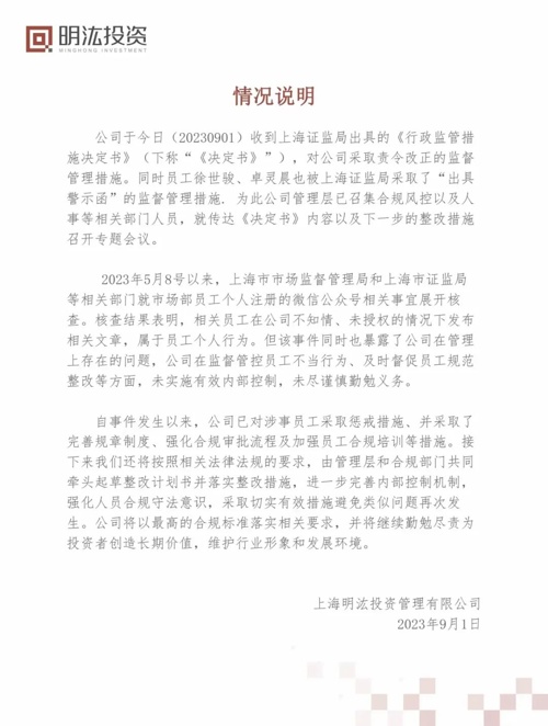 明汯称,2023年5月8号以来,上海市市场监督管理局和上海市证监局等相关部门就市场部员工个人注册的微信公众号相关事宜展开核查。核查结果表明,相关员工在公司不知情、未授权的情况下发布相关文章,属于员工个人行为。但该事件同时也暴露了公司在管理上存在的问题,公司在监督管控员工不当行为、及时督促员工规范整改等方面,未实施有效内部控制,未尽谨慎勤勉义务。