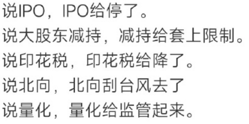 有个段子是这么说的, 现在要给的都给了,IPO适度放缓了,印花税降低了,大股东减持也被限制了,楼市也降存量房贷利率了,个人所得税也有新利好。接下来,股市得涨了