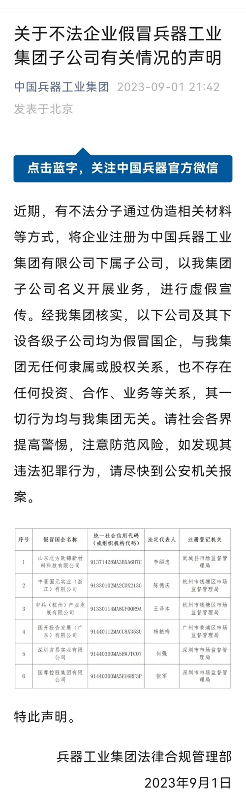 9月1日,中国兵器工业集团微信公众号发布《关于不法企业假冒兵器工业集团子公司有关情况的声明》。