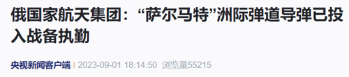 据塔斯社报道,当地时间9月1日,俄罗斯国家航天集团公司总裁鲍里索夫表示,“萨尔马特”洲际弹道导弹已投入战备执勤。