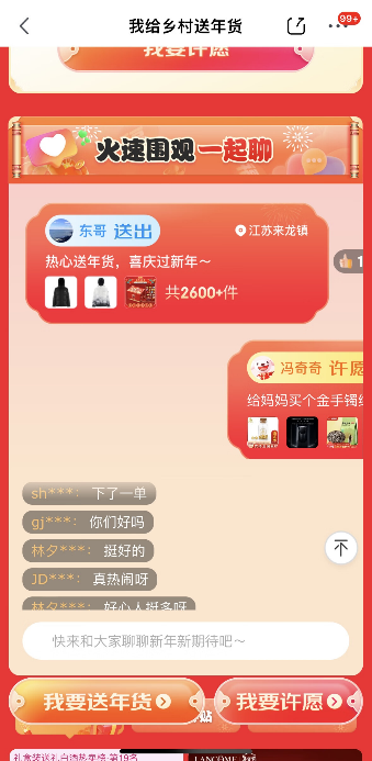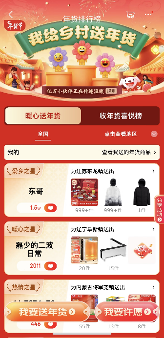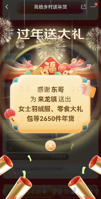 据悉,日前京东携手百大品牌发起了一项名为“我给乡村送年货”的活动,邀请全国各地用户为家乡、为亲朋好友送年货。
