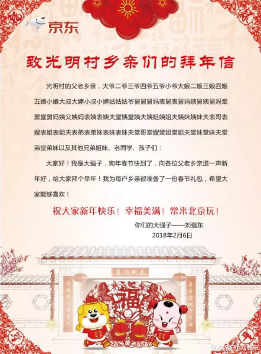 2018年春节,刘强东也为当时全村的800多户人家送去春节大礼包,鸡鸭鱼肉,家电生活用品,样样齐全。此外,他还写了一封《致光明村乡亲们的拜年信》,落款为“你们的大强子”,处处透露着对家乡父老乡亲的思念。