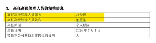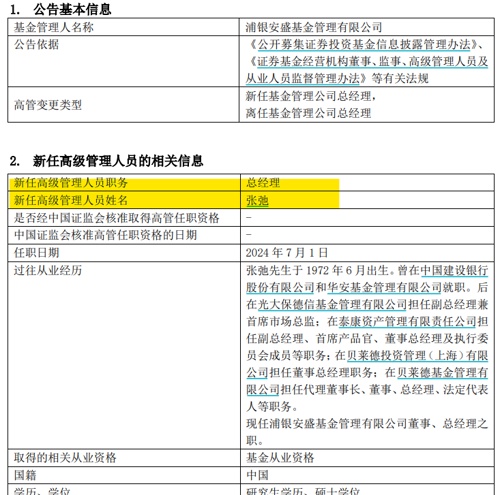 7月1日晚间,浦银安盛基金发布《高级管理人员变更公告》。公告显示,郁蓓华因个人原因离任公司总经理,离职日期是2024年7月1日,没有转任公司其他工作岗位的说明。同时浦银安盛基金宣布,任命张弛为总经理。