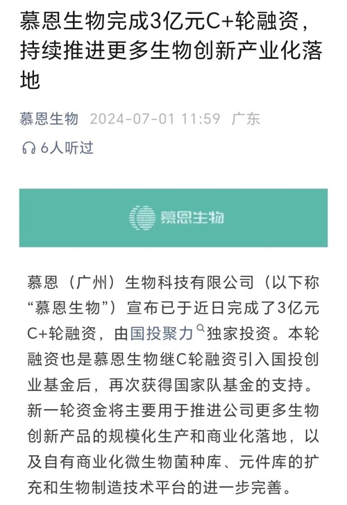 慕恩生物7月1日宣布,公司已于近日完成了3亿元C+轮融资,由国投聚力独家投资。本轮融资也是慕恩生物继C轮融资引入国投创业基金后,再次获得国家队基金的支持。新一轮资金将主要用于推进公司更多生物创新产品的规模化生产和商业化落地,以及自有商业化微生物菌种库、元件库的扩充和生物制造技术平台的进一步完善。