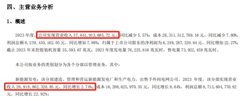 2023年,龙源电力实现营业收入376.42亿元。按业务类别划分,公司新能源发电业务实现营业收入289.19亿元,同比增长2.74%;火力发电业务实现营业收入84.18亿元,同比下降28.14%。