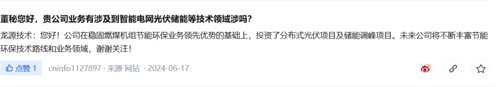 6月17日,龙源技术在互动平台上表示,公司在稳固燃煤机组节能环保业务领先优势的基础上,投资了分布式光伏项目及储能调峰项目,未来将不断丰富节能环保技术路线和业务领域。