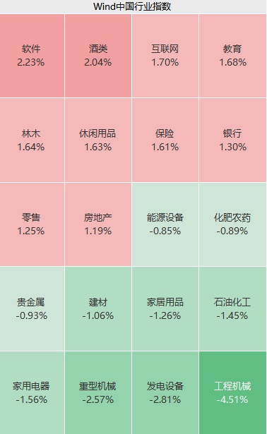 行业上,上午软件板块大幅走高,数字政府、网络安全、数字货币等概念火热,多股狂拉20CM涨停;酒类、教育、银行、地产接连走高;工程机械板块大跌,稀土永磁、光伏逆变器、稀有金属等概念回调。