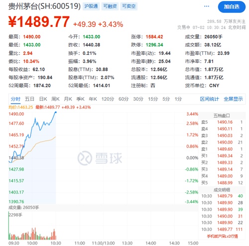 7月2日上午,贵州茅台持续拉升,盘中涨超3%。