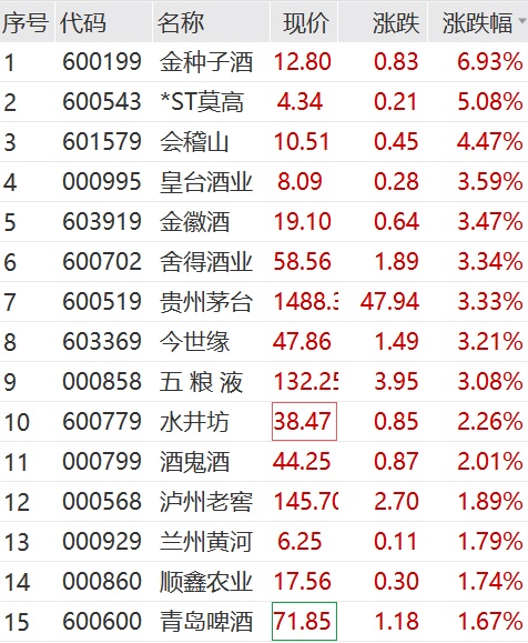 在贵州茅台的带动下,上午白酒股整体回暖,金种子酒、会稽山、金徽酒、五粮液等涨幅居前。