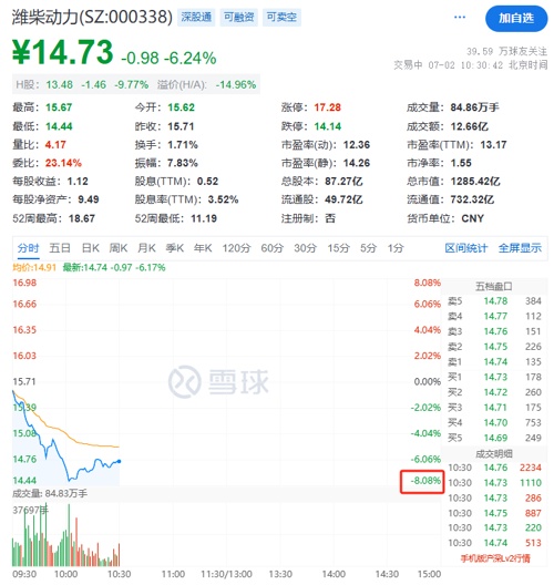 7月2日上午,老牌白马股潍柴动力盘中跳水,A股股价最低跌至15.67元/股,跌幅一度超过8%。