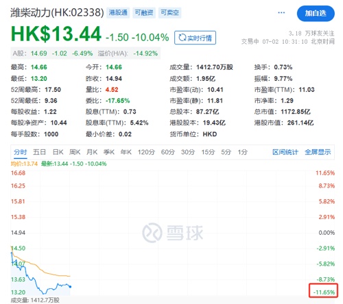 潍柴动力港股同步走低,盘中跌幅一度超过11%。