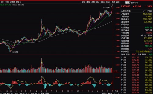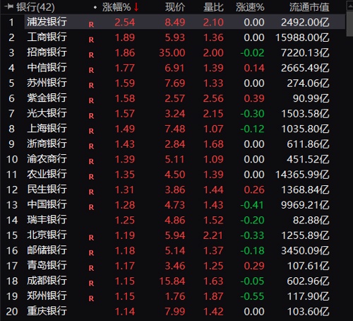 浦发银行大涨2.54%,工商银行、招商银行也涨超1.8%,中信银行、苏州银行、紫金银行、光大银行等涨超1.5%。