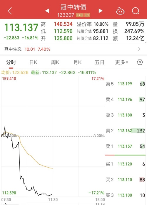 上午部分低价转债强力反弹,不过高绝对价格、高溢价率的冠中转债却在早盘一度涨超3%的情况下,突然闪崩暴跌,上午收跌近17%,自高位下来跌约20%。而正股冠中生态却大涨7.4%。