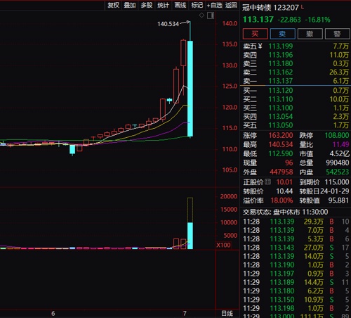 而高绝对价格、高溢价的冠中转债,却在开盘大涨超3%后,突发闪崩“坠落”,上午收盘跌近17%。交易价格自盘中高点下来跌约20%,暴跌或因前几个交易日价格炒作涨幅较大。