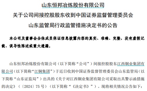 8月2日,恒邦股份发布公告称,江铜集团近日收到山东证监局出具的《关于对江西铜业集团有限公司采取出具警示函措施的决定》。
