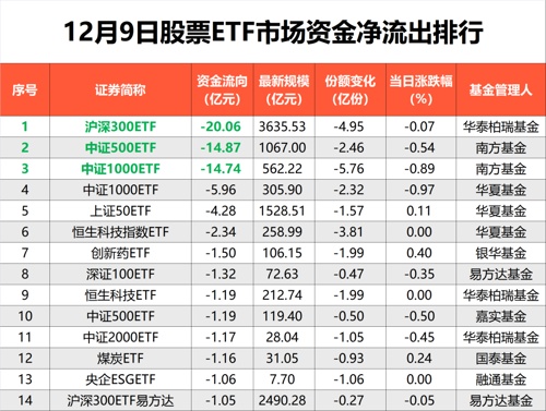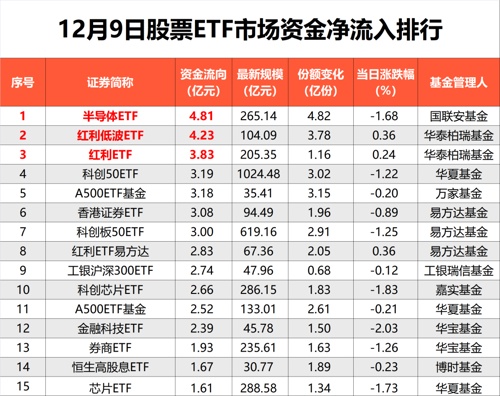 12月9日,沪指冲高回落,深成指、创业板指盘中跌超1%,尾盘跌幅有所收窄。机器人概念股逆势爆发,地产股震荡走低,市场呈现明显分化态势。在昨日市场低迷时期,资金借道股票ETF净流出超20亿元。昨日A股收盘后,新华社发布重磅消息,中共中央政治局12月9日召开会议,分析研究2025年经济工作。其中提到“实施更加积极有为的宏观政策,扩大国内需求”,要求“稳住楼市股市,防范化解重点领域风险和外部冲击”,同时,提出“稳定预期、激发活力,推动经济持续回升向好”。利好消息发布后,今日A股开盘大涨,宽基ETF、行业ETF等迎来普涨行情。Wind数据显示,截至12月9日,全市场959只股票ETF(含跨境ETF)总规模达3.34万亿元。在当日股市震荡行情中,净流出资金为20.62亿元。细分品类中,上一交易日行业ETF及Smart Beta ETF净流入居前,分别达13.01亿元和12.8亿元。规模变化方面,港股ETF规模增加97.13亿元。具体到指数维度,12月9日,科创50指数单日净流入居首,净流入6.83亿元,龙头产品科创50ETF单日净流入超3亿元。行业上看,芯片、红利相关指数进入单日净流入前五。半导体ETF、红利低波ETF、红利ETF位居昨日资金净流入前三强。从5日角度观测,中证A500指数累计净流入累计达35.4亿元,仍保持相对领先位置,但流入优势近期快速收窄。头部基金公司旗下ETF继续获得资金净流入。12月9日,易方达旗下ETF整体获得资金净流入8.15亿元,其中香港证券ETF(513090)当日净流入3.22亿元,科创板50ETF(588080)和红利ETF易方达(515180)也分别获得2.99亿元、2.82亿元净流入,此外,人工智能ETF、科创创业ETF也获得不同程度净流入。华夏基金ETF中,12月9日,科创50ETF和A500ETF基金分别获得3.19亿元和2.52亿元净流入,规模分别达1024.48亿元和133.01亿元,市场关注其投资价值。对应跟踪指数近一月日均成交额分别为62.85亿元和30.91亿元。昨日震荡回调中,宽基ETF净流出居前,达59.92亿元,总体规模减少139.98亿元。宽基指数中,中证1000指数单日净流出居前,达到22.45亿元。南方、华夏等公募旗下中证1000ETF资金净流出靠前。另外,沪深300ETF单日净流出超20亿元,位居全市场首位;中证500ETF也有超14亿元的净流出。行业或主题ETF中,创新药ETF、恒生科技ETF、煤炭ETF等净流出居前,单日净流出资金都超过1亿元。虽然宽基指数出现短期净流出,但市场机构仍然看好未来A股市场。中欧基金表示,随着12月中央经济工作会议的临近,市场在对于政策面或延续积极态度的预期下连续上涨。在明年两会前,市场对经济刺激政策的期待很难出现降温,但地缘政治风险可能持续干扰市场的上行趋势。12月至来年春节前往往是对于第二年行情预演的窗口期,考虑到政策预期渐浓,市场交易热度维持高位,在经历11月的震荡后,后续市场有望偏乐观。国泰基金也表示,预计市场长期熊市终结,投资上需要保持战略积极把握结构性机会。另外,在大小盘风格上,过度偏向小盘的极化结构正在调整,风格或阶段正逐渐转向大盘。