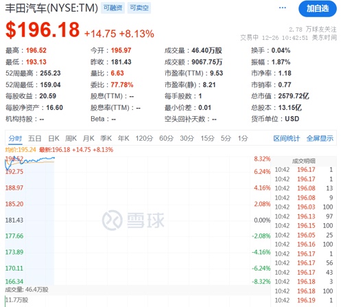 丰田汽车股价暴涨8%,消息面上,有报道称这家日本汽车制造商计划将其净资产收益率(ROE)提高一倍至20%。