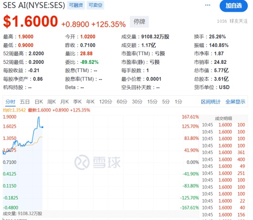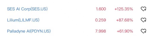 此外,美股无人机概念股大涨,Lilium涨超87%,Palladyne AI涨超60%,SES AI涨超100%。