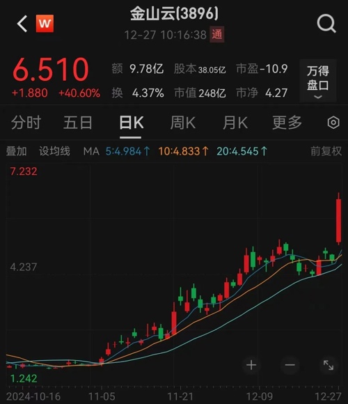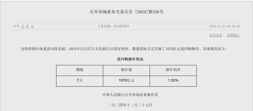 央行公告称,为保持银行体系流动性充裕,12月27日以固定利率、数量招标方式开展了1078亿元7天期逆回购操作,操作利率1.50%。Wind数据显示,当日1016亿元逆回购到期。业内专家表示,MLF缩量续作反映市场流动性充裕,资金面保持宽松态势。此次MLF操作只投放3000亿元,说明央行对当前市场流动性状况的判断是充裕的,进一步大量投放的必要性较低。同时,随着今年以来央行工具箱得到了进一步扩充,在公开市场操作中增加了国债买卖、买断式逆回购等工具,也有条件适度平滑四季度集中到期的MLF,减轻滚续操作压力。新货币政策操作框架下,MLF操作更加市场化,中标利率已不具备政策含义。今日早间,A股市场上,银行股承压,保险、券商等大金融板块纷纷回吐前段时间的涨幅,微盘股再度活跃。截至发稿,三大指数涨跌不一,深证成指、创业板指纷纷由绿翻红,全市场超4000只个股上涨。盘面上,低空经济、军工板块领涨,海南自贸港概念突然拉升,海南瑞泽、欣龙控股、神农种业、凯撒旅业、康芝药业等多股涨停。消息面上,12月26日,“加快推进海南自由贸易港核心政策落地”研讨会在海口召开。本次研讨会围绕当前形势下如何理解海南自由贸易港核心政策、如何尽快形成加快推进海南自由贸易港核心政策落地的重要条件等议题展开研讨。12月27日早盘,AI应用概念股金山云高开12%后涨幅进一步扩大,盘中一度飙升44%至6.7港元/股,股价创历史新高;该股自今年11月初启动上涨行情至今,已累涨近3倍。消息面上,11月19日,金山云宣布与小米签署新框架协议。协议中提到,金山软件未来三年的年度上限建议分别为23.10亿元、31.38亿元及40.35亿元。机构普遍认为,随着小米计划将人工智能(AI)深度融入其生态链,加之对算力的巨大需求,金山云作为其合作伙伴,必将迎来业务的显著增长。其中,广发证券表示,看好公司后续随着小米将AI深度整合进生态链之后的算力需求。瑞银称,金山云受惠于AI发展及金山生态系统的支持,认为市场低估了金山云和AI业务潜在发展机会。据了解,金山云是金山集团旗下云计算企业,也是一家典型的雷军系企业,公司前三大股东,分别为金山软件、小米集团以及雷军个人,合计持股比例超六成。