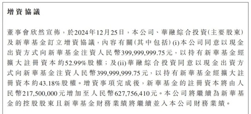 【导读】股权变更尘埃落定后,新华基金获股东方8亿元注资12月27日,港股上市公司恒泰证券公告,恒泰证券和北京华融共向新华基金注资799,999,999.50元。新华基金注册资本金由人民币217,500,000元大幅增加至人民币627,756,410元。作为一家成立20年的老牌公募,新华基金此番获得股东8亿元“真金白银”输血,显示出股东对其发展潜力的信心,同时在当前复杂多变的环境下,注资也有望为公司的长远布局和持续发展进一步筑牢根基。恒泰证券最新公告显示,12月25日,恒泰证券和北京华融分别向新华基金增资399,999,999.75元,持有新华基金经扩大注册资本约52.99%和43.18%的股权。增资事项完成后,新华基金注册资本金由人民币217,500,000元大幅增加至人民币627,756,410元。本公司将继续为新华基金控股股东,且新华基金财务业绩将继续并入公司财务业绩。此次增资距离新华基金股权变更正式落地不到一周时间,动作可谓迅速。就在12月20日,证监会发布《关于核准新华基金管理股份有限公司变更主要股东的批复》,核准北京华融成为新华基金的主要股东,并依法受让新华基金6592.52万股股份(占公司股份总数30.3104%)。2023年1月,证监会核准北京金融街投资(集团)有限公司(以下简称金融街集团)成为恒泰证券和新华基金的实控人。2023年8月,新华基金原第二大股东新华信托所持有的35.31%股权被公开拍卖,由北京华融及重庆市江北区国有资本投资运营管理集团有限公司(以下简称江北国投)以2.71亿元成功合拍,日前正式获批的就是此部分股权受让。据公开资料,北京华融是金融街集团的全资子公司,其实际控制人为北京市西城区国资委,江北国投为重庆市江北区政府的全资国有公司。随着本次注册资本的增加,新华基金股权结构也得到进一步调整。增资后,金融街集团通过恒泰证券和北京华融将直接或间接实控新华基金超过95%股权,“国资公募”新华基金正整装待发。新华基金是一家成立于2004年的老牌公募基金,注册地位于重庆市,是我国西南地区第一家公募基金,经营管理中心位于北京市。12月4日,新华基金公告称,公司董事长一职由恒泰证券党委副书记、总裁银国宏兼任。对此,新华基金曾表示,恒泰证券是新华基金的控股股东,恒泰证券党委副书记、总裁银国宏兼任公司董事长,将在战略紧密协同、资源共享调配、内部沟通顺畅等方面更有助于新华基金的长远发展。据知情人士称,银国宏自2023年到任后,带领恒泰证券在严峻的市场环境下实现了业务稳健前行,公司扭亏为盈,自营、经纪以及资管业务发展势头良好。此次实控人金融街集团让其身兼两职,同时掌舵券商和公募基金,也体现了公司内外部对其高度认可。Wind数据显示,截至2024年三季度末,新华基金管理的公募基金总规模为521.69亿元,行业排名第80名,其中,非货规模为350.42亿元。值得一提的是,时隔两年,新华基金今年终于迎来新产品发行,下半年新华中债0-3年政策性金融债和新华红利低波ETF接连成立,募集规模分别达到60亿元和4.26亿元。12月13日,公司还上报了新华中证A500指数增强型证券投资基金。业内认为,在股东全方位助力下,新华基金有望进一步提升业务规模与品质,实现长期稳健发展,全面开启新征程。