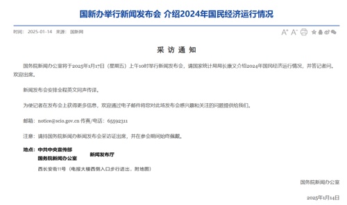 据国新办网站发布,国务院新闻办公室将于2025年1月17日(星期五)上午10时举行新闻发布会,请国家统计局局长康义介绍2024年国民经济运行情况,并答记者问。