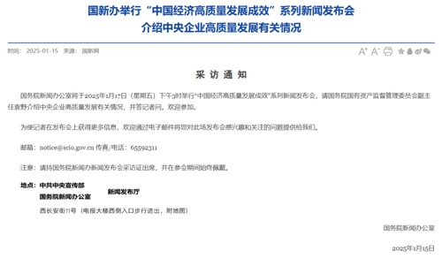国务院新闻办公室将于2025年1月17日(星期五)下午3时举行“中国经济高质量发展成效”系列新闻发布会,请国务院国有资产监督管理委员会副主任袁野介绍中央企业高质量发展有关情况,并答记者问。