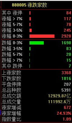 市场共3368只个股上涨,84只个股涨停,1816只个股下跌。