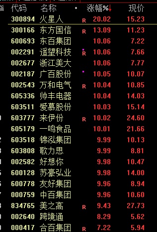 家电、零售等消费股拉升,火星人、浙江美大、帅丰电器、深康佳A等多股涨停。