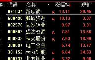 有色、油气、煤炭等周期股走高,准油股份、鹏欣资源、闽发铝业、安源煤业涨停。