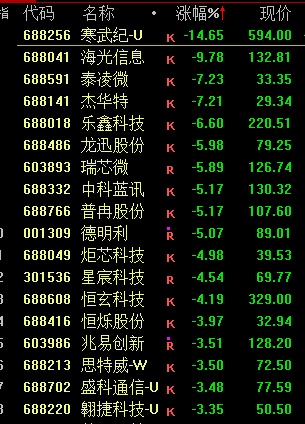 下跌方面,芯片股下挫,寒武纪大跌超14%。