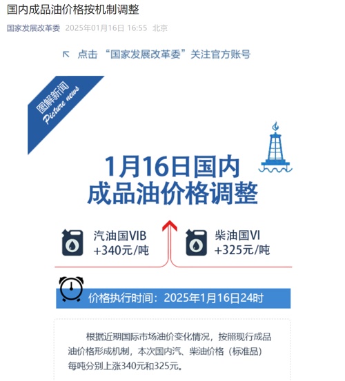 【导读】国家发展改革委宣布:国内汽、柴油价格每吨分别上涨340元、325元1月16日,国家发展改革委官方消息显示,根据近期国际市场油价变化情况,按照现行成品油价格形成机制,自2025年1月16日24时起,国内汽、柴油价格(标准品)每吨分别上涨340元和325元。折算成升价后,预计92#汽油、95#汽油、0#柴油分别上调0.27元、0.28元、0.28元。车主想要加满一箱50L的92#汽油,将多花13.5元。开油车的朋友们,建议今天下班后最好加满油箱。私家车方面,以月跑2000公里、百公里平均油耗为8L的燃油汽车为例,下次调价窗口开启前(2月6日24时),单辆车的燃油成本将增加30元左右。物流行业方面,以月跑10000公里、百公里平均油耗为38L的重型卡车为例,在下次调价窗口开启前,单辆车的燃油成本将增加745元左右。春节假期探亲访友增多,公众自驾出行处于高峰,由于本轮成品油零售价格上调幅度偏大,预计公众自驾出行高峰期间用车成本也将随之提高。结合近期各地油价情况来看,本轮成品油价格调整落地后,各地95#汽油将全面进入“8元时代”,辽宁、云南、贵州等地的92#汽油也将接近8元/升。进入2025年以来,国内成品油价格已经历一轮上涨。1月2日,国家发展改革委宣布,自1月2日24时起,国内汽、柴油价格每吨均上涨70元。也即,在此次调整落地后,国内油价实现“两连涨”。卓创资讯成品油分析师王芦青介绍称,本轮调价周期内,由于美元走弱以及美国对欧洲某国石油出口限制措施,加上寒冬天气美国燃油需求增加,美国原油库存连续下降等多重利好因素共振,两大原油期货整体呈现偏强运行行情。受此影响,原油变化率正值内持续走高。1月15日,国际油价继续走高。截至当天收盘,纽约商品交易所2月交货的轻质原油期货价格上涨2.54美元,收于每桶80.04美元,涨幅为3.28%;3月交货的伦敦布伦特原油期货价格上涨2.11美元,收于每桶82.03美元,涨幅为2.64%。对于后续油价的展望,隆众资讯油品分析师李彦认为,今年春节前及春节假期,利多因素主要来自海外机构持续看好亚洲需求前景改善、部分产油国面临西方新的制裁压力,以及欧美局部地区严寒天气提振燃料需求;利空因素则是欧美需求现状改善缓慢,以及降息步伐放缓背景下美元强势不改。此外,OPEC+减产延续,油价底部支撑仍有保障,但美国新一届政府的政策为油价带来较大的不确定性。