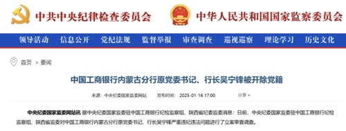 【导读】中国工商银行内蒙古分行原党委书记、行长吴宁锋被开除党籍1月16日,中央纪委国家监委官网通报:中国工商银行内蒙古分行原党委书记、行长吴宁锋被开除党籍。据中央纪委国家监委驻中国工商银行纪检监察组、陕西省纪委监委消息:日前,中央纪委国家监委驻中国工商银行纪检监察组、陕西省监委对中国工商银行内蒙古分行原党委书记、行长吴宁锋严重违纪违法问题进行了立案审查调查。丧失理想信念,背弃初心使命,政治意识淡漠,与他人串供、销毁证据,对抗组织审查;违反中央八项规定精神,收受可能影响公正执行公务的礼品、礼金,借婚丧喜庆之机敛财,接受可能影响公正执行公务的宴请,违规出入私人会所,组织公款吃喝,违规公车私用,长期占用单位客房供个人使用;函询时不如实向组织说明问题,在干部职工的录用、职务职级的调整上,为他人谋取利益并收受财物;借用管理和服务对象钱款,将本人应支付费用交由他人支付,违规为亲属吸收存款提供帮助;工作中不负责任、疏于管理,干预和插手单位经营活动,给工商银行造成重大损失;利用职务便利为他人在贷款审批方面谋利,并非法收受巨额财物;违规审批发放贷款,数额巨大。通报指出,吴宁锋严重违反党的组织纪律、廉洁纪律、工作纪律,构成严重职务违法并涉嫌犯罪,且在党的十八大后不收敛、不收手,性质严重,影响恶劣,应予严肃处理。依据《中国共产党纪律处分条例》《中华人民共和国监察法》《中华人民共和国公职人员政务处分法》等有关规定,经中国工商银行党委研究,决定给予吴宁锋开除党籍处分;按规定取消其享受的待遇;收缴其违纪违法所得;陕西省监委将其涉嫌犯罪问题移送检察机关依法审查起诉,所涉财物一并移送。公开信息显示,吴宁锋出生于1960年3月,中共党员,研究生,高级经济师;1977年9月参加工作。据悉,吴宁锋在工商银行工作多年,曾任工商银行陕西省分行副行长、新疆分行行长、西北内审局局长、内蒙古分行行长等职务。2024年7月,据中央纪委国家监委驻中国工商银行纪检监察组、陕西省纪委监委消息,中国工商银行内蒙古分行原党委书记、行长吴宁锋涉嫌严重违纪违法,接受中央纪委国家监委驻中国工商银行纪检监察组纪律审查和陕西省监察委员会监察调查。