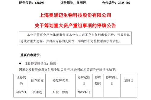 【导读】奥浦迈拟筹划重大资产重组事项,股票停牌