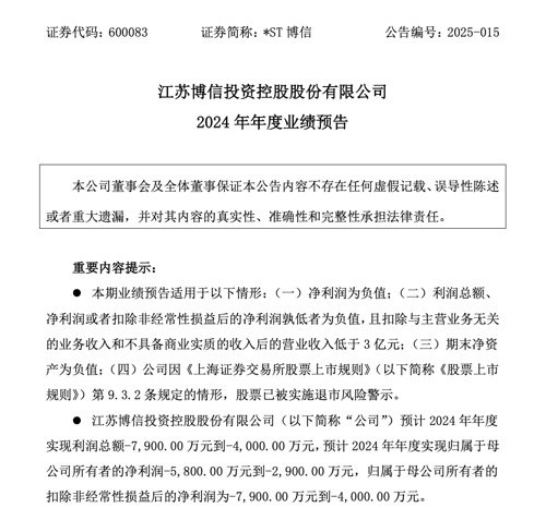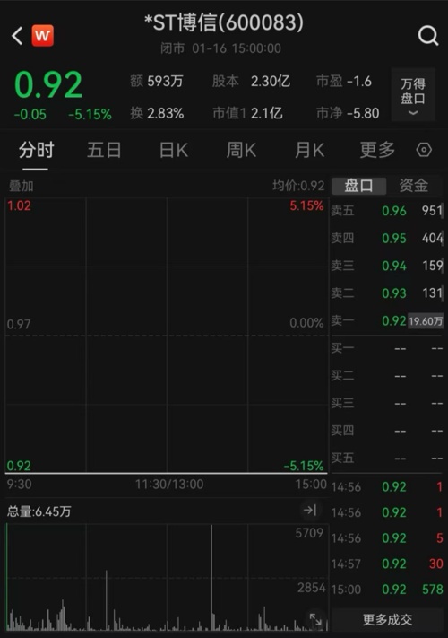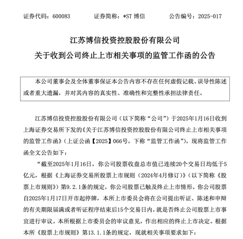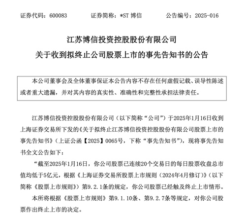 1月16日晚间,*ST博信发布公告称,因收盘总市值已连续20个交易日低于5亿元,触及终止上市条件,公司股票将自1月17日(周五)开市起停牌。1月16日,*ST博信再次跌停,收报0.92元/股,收盘总市值为2.1亿元,已连续20个交易日低于5亿元。同日,*ST博信收到上交所下发的《关于拟终止江苏博信投资控股股份有限公司股票上市的事先告知书》《关于江苏博信投资控股股份有限公司终止上市相关事项的监管工作函》。根据相关规定,上交所对*ST博信股票作出终止上市的决定。如公司申请听证,应当在收到通知后5个交易日内,提交载明申请听证事项及申辩理由的书面听证申请。上交所还要求*ST博信及时披露并充分提示风险,做好股票终止上市的有关工作,并维护公司正常生产经营活动,保护公司和全体股东利益。同日发布的业绩预告显示,*ST博信预计2024年净利润为-5800万元至-2900万元,与2023年净亏损2亿元相比,亏损金额有所减少。对于2024年业绩预亏的原因,*ST博信表示,公司因资源有限,同时为了控制经营风险,对智能硬件及其衍生产品业务实施了业务收缩战略,使得公司智能硬件及其衍生产品业务规模缩减。此外,风电行业、城市基建的投资建设仍在复苏过程中,市场需求不及预期,叠加供给端竞争激烈,使得公司设备租赁业务收入规模缩小,综合导致公司经营效益下降。*ST博信的主要业务包括装备综合服务业务和智能硬件及其衍生产品业务。截至去年9月末,公司股东总户数为1.86万户。