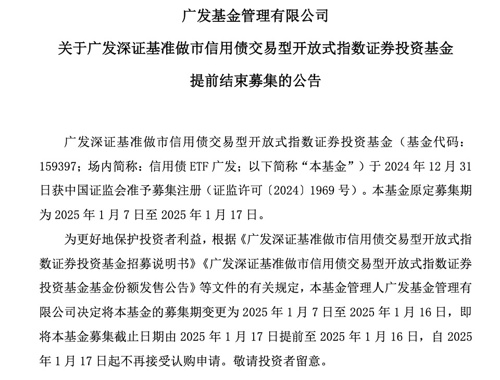 首批基准做市信用债ETF从上报、获批、发行,备受市场关注。据中国基金报记者统计,截至1月16日晚,广发、天弘、博时、大成、易方达、华夏、海富通、南方等基金公司旗下基准做市信用债ETF均已结束募集,其中绝大多数ETF提前结束募集,不少产品进行了比例配售。去年底债券市场走强,后续走势牵动人心。在业内人士看来,经过前期强势表现之后,近期债市出现调整,中长期仍有支撑,短期要注意波动风险。1月16日晚间,广发基金公告称,广发深证基准做市信用债ETF原定募集期为1月7日至1月17日。为了更好地维护基金份额持有人利益,根据有关规定,决定将募集截止日提前至1月16日。1月16日晚,天弘基金也公告,于1月16日提前结募的天弘深证基准做市信用债ETF因累计有效认购申请份额(不包括募集期利息和认购费用)已超过首次募集规模上限30亿份(折合为金额30亿元人民币),将对1月16日的有效认购申请采取“末日比例确认”的方式予以部分确认。实际上,此前首批基准做市信用债ETF就陆续宣布提前结束募集,不少产品还比例配售。如1月15日,于1月13日提前结募的博时深证基准做市信用债ETF发布比例确认公告,1月13日当日网上现金、网下现金的有效认购申请确认比例为98.08%。1月14日,易方达上证基准做市公司债ETF、大成深证基准做市信用债ETF齐齐发布公告提前结募,将原定的1月22日、1月20日的募集截止日期均提前至1月13日。海富通上证基准做市公司债ETF原定的募集截止日则由1月17日提前至1月10日。此外,南方上证基准做市公司债ETF率先宣布已于1月8日提前结束募集,仅用两个工作日即募满30亿元发行上限,最终末日有效认购申请确认比例结果为98.70%,并成为首只成立的基准做市信用债ETF。至此,1月7日集体发售的首批8只基准做市信用债ETF已全部募集结束。除了华夏上证基准做市信用债ETF于1月13日募集截止日正常结束募集,其余7只均实现提前结募。Wind统计显示,截至1月16日,21只已上市债券ETF总规模超过1844亿元。如果算上已结束募集的首批8只基准做市信用债ETF,债券ETF总规模已超2000亿元。作为债券ETF中的“新面孔”,基准做市信用债ETF是一种新型债券交易型开放式指数基金,主要跟踪的是深证基准做市信用债指数或上证基准做市公司债指数。这些成份券信用评级较高,且发行主体以央国企为主,信用风险较低。与已有的债券ETF相比,基准做市信用债ETF的主要区别在于其专注于信用债市场,且底层债券在交易所制度层面获得了做市支持,流动性显著优于普通债券ETF。在业内人士看来,由于基准做市信用债ETF底层标的为中高等级信用债,这些债券发行规模大、信用评级高、流动性好,预计在适度宽松的货币政策下具备一定的投资价值。此外,机构资金配置需求旺盛,也是新产品受资金青睐的主要原因。嘉实基金李宇昂表示,在资金面宽松背景下,利率债与信用债的性价比需综合权衡。从全年来看,利率债策略空间更大,更适合作为主要配置。不过,信用债在经历调整后,配置价值可能重新显现,投资者需密切关注市场变化,灵活调整投资组合,平衡利率债与信用债的配置比例。