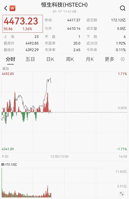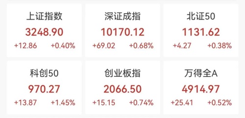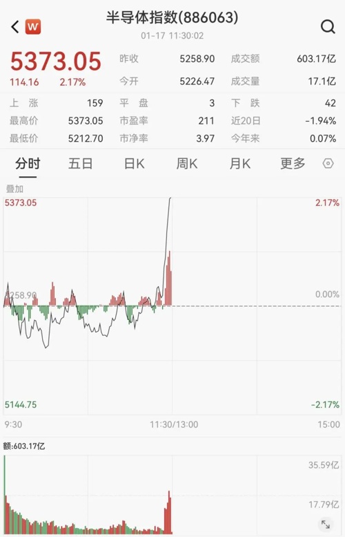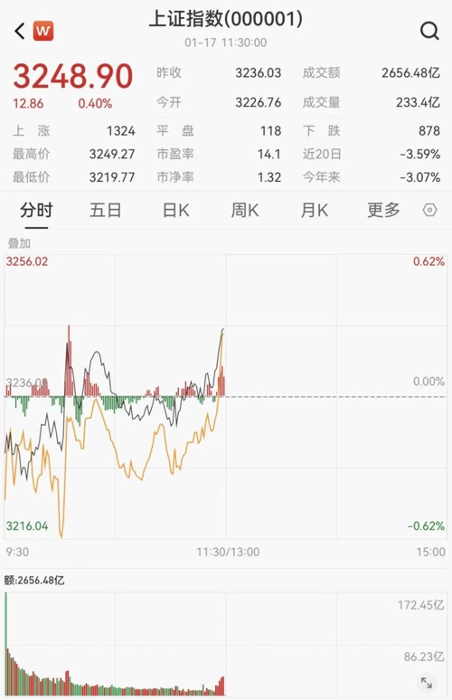 1月17日,A股三大指数早盘小幅震荡,午前集体上攻。截至午间收盘,沪指涨0.4%,深成指涨0.68%,创业板指涨0.74%。