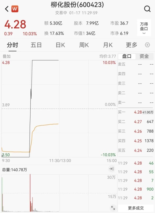 柳化股份盘中直线拉升封涨停,上演“地天板”,录得5天4板。
