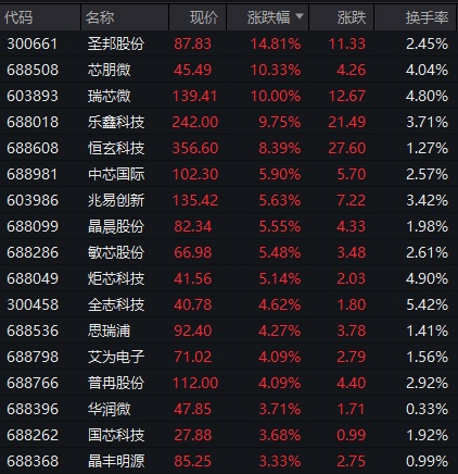 半导体芯片股午前强势拉升,圣邦股份、芯朋微、瑞芯微、乐鑫科技涨幅居前。
