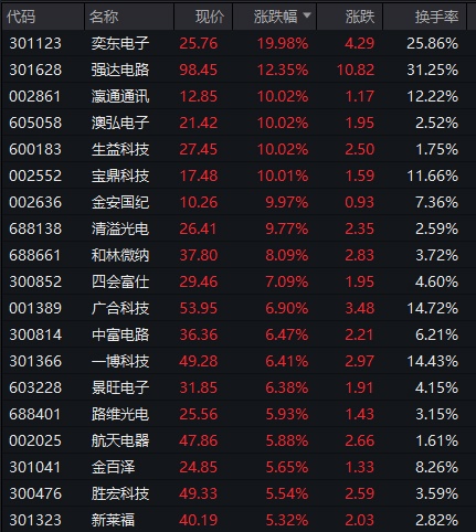 此外,电子元器件板块强势拉升,奕东电子20CM涨停,瀛通通讯、澳弘电子、生益科技等多股直线拉涨停。
