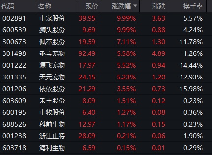 宠物经济概念盘中走强,狮头股份实现4连板,中宠股份涨停,佩蒂股份、源飞宠物、天元宠物等跟涨。
