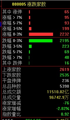 市场共2619只个股上涨,65只个股涨停,2535只个股下跌。