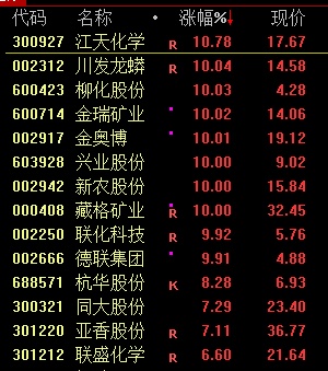 化工板块拉升,柳化股份、金瑞矿业、藏格矿业、川发龙蟒等封板。