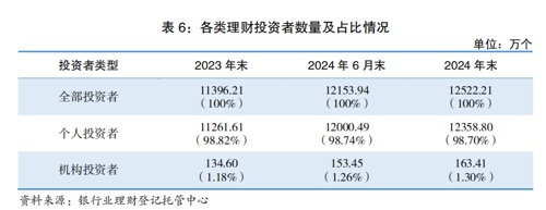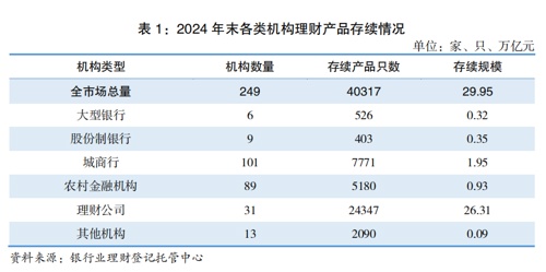 【导读】去年银行理财市场存续规模逼近30万亿元,为投资者创造收益超七千亿元1月17日,银行业理财登记托管中心发布的报告显示,截至2024年年末,我国银行理财市场存续规模已达29.95万亿元,较年初增长11.75%。持有理财产品的投资者数量已达1.25亿个,较年初增长9.88%。2024年,理财产品为投资者创造收益7099亿元。银行业理财登记托管中心发布的《中国银行业理财市场年度报告(2024)》显示,2024年,全国共有179家银行机构和31家理财公司累计新发理财产品3.08万只,累计募集资金67.31万亿元。截至2024年年末,全国共有218家银行机构和31家理财公司有存续的理财产品,共存续产品4.03万只,较年初增加1.23%;存续规模达29.95万亿元,较年初增加11.75%。分机构类型来看,截至2024年年末,理财公司存续产品数量和金额均最多,存续产品只数为2.43万只,存续规模为26.31万亿元,较年初增加17.09%,占全市场的比例达87.85%。《报告》还显示,截至2024年年末,银行业理财登记托管中心个人养老金理财行业平台共支持6家理财公司发行30只个人养老金理财产品,累计销售金额超过90亿元;年内正式推出信息披露文件分发服务,进一步提升信息披露工作质效;中央数据交换平台实现961家机构全面接入、全面使用,业务发生额近90万亿元。理财产品正在充分发挥资金优化配置功能,通过多种途径实现资金与实体经济融资需求对接。资料显示,截至2024年年末,银行理财产品通过投资债券、非标准化债权、未上市股权等资产,支持实体经济资金规模约21万亿元。目前理财产品资产配置以固收类为主。2024年投向债券类、非标准化债权类资产、权益类资产余额分别为18.60万亿元、1.74万亿元、0.83万亿元,分别占总投资资产的57.89%、5.42%、2.58%。2024年,理财资金投向绿色债券总规模超3300亿元,投向“一带一路”沿线市场、区域发展、扶贫纾困等专项债券规模超1100亿元,为中小微企业发展提供资金支持超4.8万亿元。为助力我国实现碳达峰、碳中和目标,理财市场2024年累计发行ESG主题理财产品168只,合计募集资金超1600亿元。截至2024年末,ESG主题理财产品存续余额达2393亿元,同比增长61.69%。理财行业还在不断推出特色产品,2024年年末存续专精特新、乡村振兴、大湾区等主题理财产品约300只,存续规模超1000亿元。2024年,理财投资者数量维持增长态势。截至2024年末,持有理财产品的投资者数量达1.25亿个,较年初增长9.88%。其中,个人投资者数量为1.24亿个,占比为98.70%;机构投资者数量占比小幅增长,数量为163万个,占比为1.30%。理财产品整体收益稳健,2024年累计为投资者创造收益7099亿元,较上一年同期增长1.69%。其中,银行机构累计为投资者创造收益1407亿元;理财公司累计为投资者创造收益5692亿元。2024年,理财产品平均收益率为2.65%。近年来,我国银行理财市场规模经历了一定的波动与增长。截至2022年底,银行理财市场存续规模27.65万亿元,到2023年底,理财市场存续规模为26.8万亿元。而到了2024年上半年,存续规模达到28.52万亿元,较年初增长6.43%,同比增长12.55%。至2024年年末,银行理财市场存续规模进一步增长至近30万亿元,年度增长近4万亿元。我国银行理财市场在稳健增长中迈上新台阶。