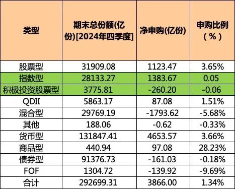 天相投顾数据显示,截至2024年四季度末,各类型基金(含联接基金)期末总份额为29.27万亿份,比上季末增加3866亿份,增幅为1.34%。