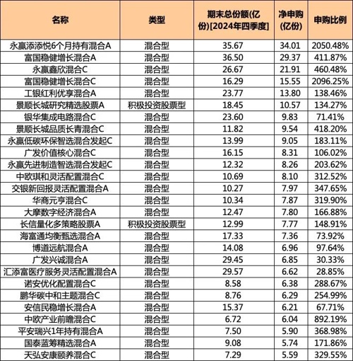 由刘星宇等掌舵的偏债混合基金—永赢添添悦6个月持有A净申购份数居首,该基金去年四季度吸引了34.01亿份净申购,净申购比例达到2050.48%。该基金自2022年7月份成立以来表现稳健,累计净值涨幅为10.58%,位居同类前10%;由范妍管理的富国稳健增长A去年四季度获得29.36亿份净申购,位居第二,净申购比例为411.87%,去年5月加盟富国的知名基金经理范妍于10月接手该基金;位居净申购第三的永赢鑫欣混合C也是一只偏债混合品种,期间获得21.91亿份净申购,净申购比例超460%,该基金2024年收益率12.59%,位居同类前5%。