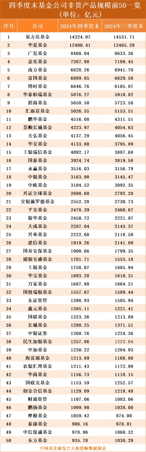 具体来看,易方达基金和华夏基金依旧是仅有的两家规模超万亿元的公司。截至2024年四季度末,易方达基金非货规模约为1.43万亿元,较三季度末减少约207亿元。