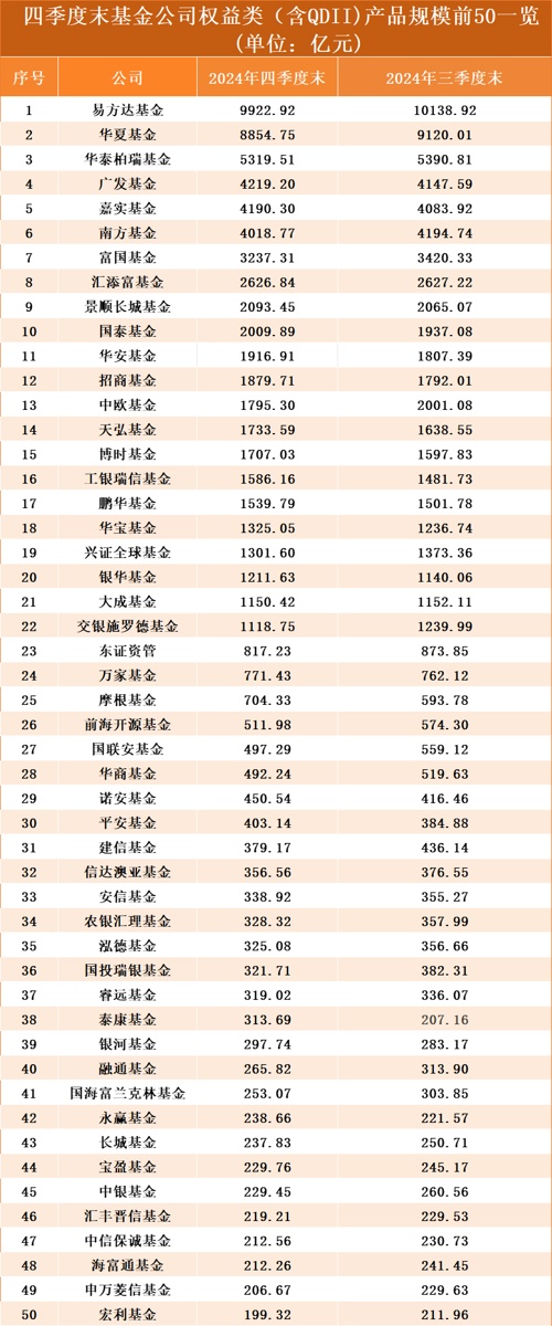 从权益类基金(含QDII)规模来看,排名前50的公司中,仅有19家去年四季度期间实现规模增长,占比38%。
