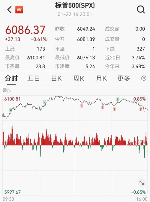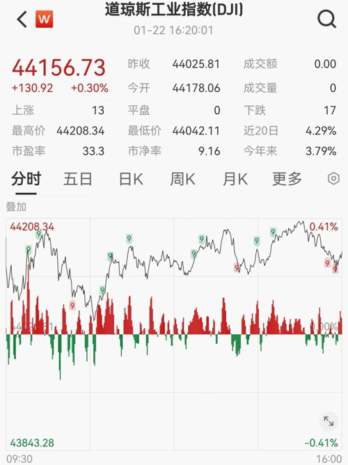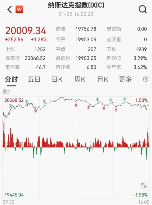 美东时间1月22日,美国三大股指全线收涨,截至收盘,道指涨0.3%,报44156.73点,标普500指数涨0.61%,报6086.37点,纳指涨1.28%,报20009.34点,收复20000点关口。