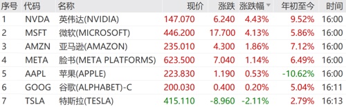 大型科技股多数上涨,万得美国科技七巨头指数涨1.90%。英伟达涨4.43%,微软涨4.13%,亚马逊涨1.86%,领涨该指数成份股。